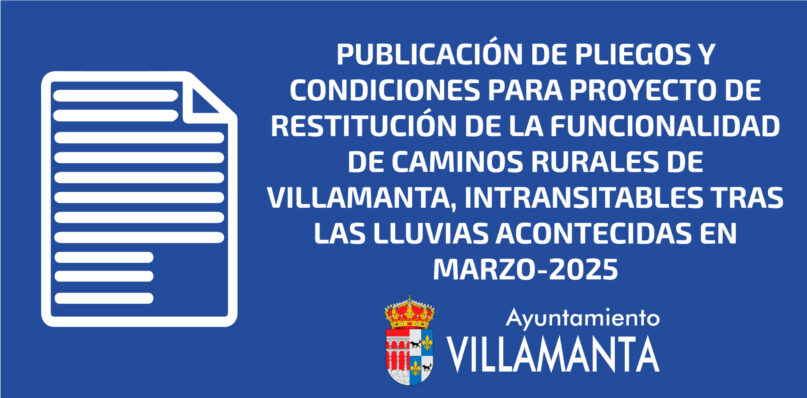 El Ayuntamiento de Villamanta publica la memoria justificativa y descriptiva, así como los pliegos administrativos y técnicos para la realización de la obra para la «Restitución de la funcionalidad de caminos rurales de Villamanta, intransitables tras las lluvias acontecidas en marzo-2025″ Memoria justificativa y descriptiva Restitución de la funcionalidad de caminos rurales de Villamanta, intransitables … Continue reading