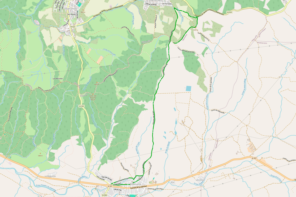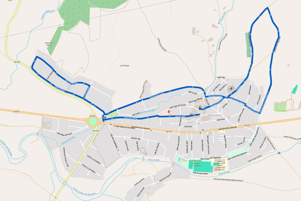 El recorrido en bicicleta tiene una longitud aproximada de 13 km, realizándose íntegramente por caminos rurales. La salida también se efectúa desde la plaza, ascendiendo en primer lugar hacia la zona del cementerio para posteriormente tomar dirección a Villanueva de Perales donde se realizará el regreso hasta Villamanta, completando así el trayecto de ida y vuelta en un entorno natural tranquilo.