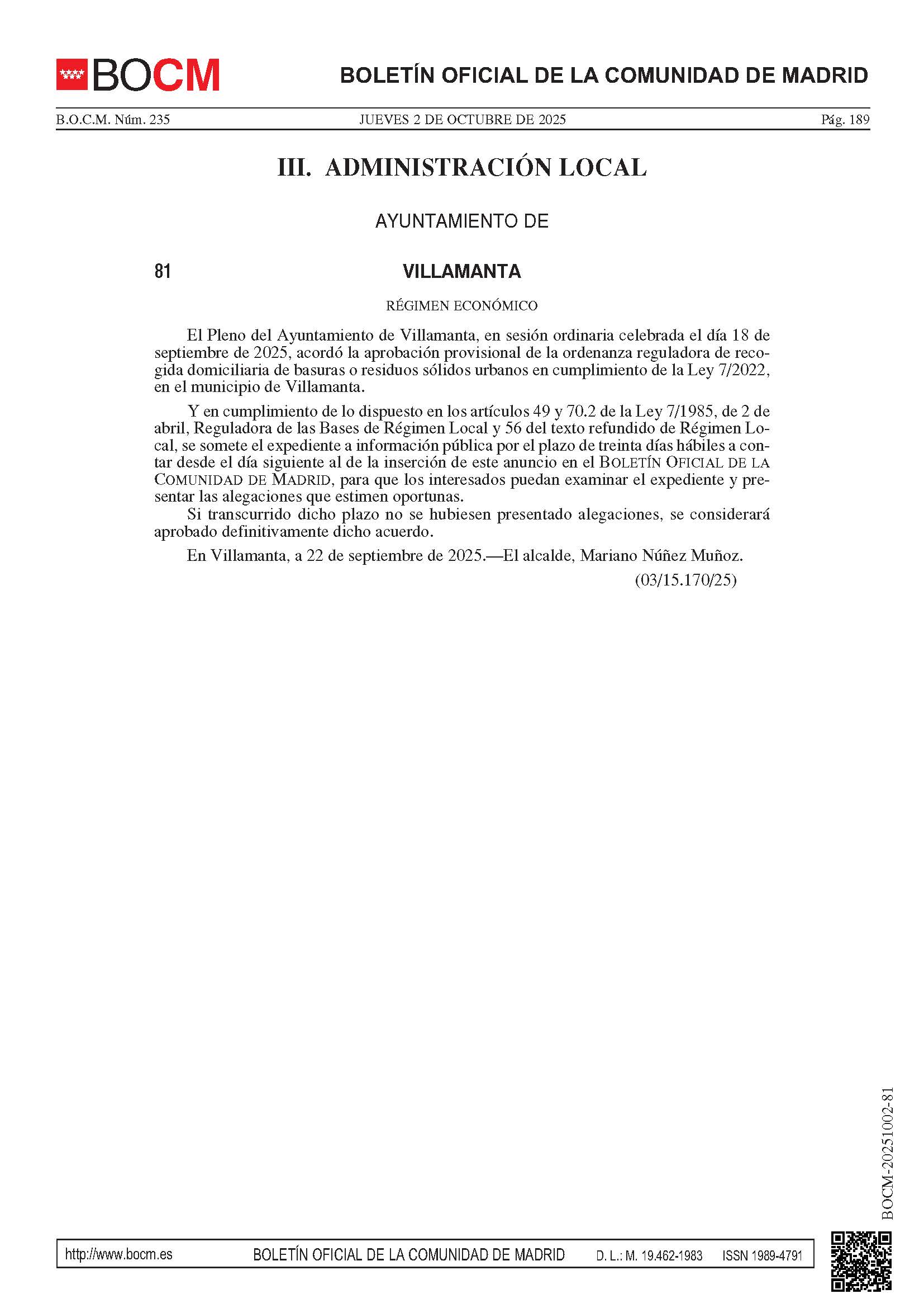 El Pleno del Ayuntamiento de Villamanta, en sesión ordinaria celebrada el día 18 de septiembre de 2025, acordó la aprobación provisional de la ordenanza reguladora de recogida domiciliaria de basuras o residuos sólidos urbanos en cumplimiento de la ley 7/2022, en el municipio de Villamanta.